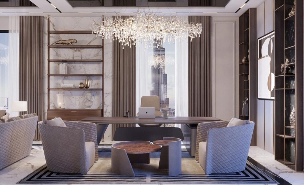 At Burj Khalifa Office View, sophistication rises to new heights. Every detail of this space has been carefully crafted to embody modern luxury and executive elegance. The interiors reflect a seamless fusion of contemporary design and timeless refinement, featuring marble surfaces, ambient lighting, and bespoke furnishings that exude authority and comfort. Expansive windows frame the iconic Burj Khalifa skyline, creating an inspiring atmosphere where productivity meets prestige. From the refined meeting areas to the elegantly appointed workspaces and lounge zones, every element has been designed to enhance focus, creativity, and style. This office redefines corporate luxury — a space where vision, design, and excellence come together in perfect harmony.